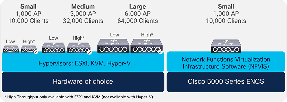 - Small (low / high throughput): Designed for distributed branches and small campuses supporting up to 1000 Access Points (APs) and 10,000 clients