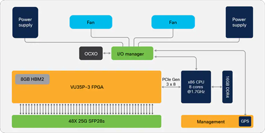The Cisco Nexus 3550-T Programmable Network Platform has a fixed form factor that is built around a dynamically reconfigurable FPGA (Field Programmable Gate Array) and provides 48 ports that are 25G capable along with an x86 (Intel® Atom® processor with 8 cores up to 1.7 GHz)-management CPU. All 48 ports are directly connected to Xilinx Virtex UltraScale Plus VU35P FPGA with a “-3” speed grade. The FPGA has 8GB of High Bandwidth Memory (HBM) on board.